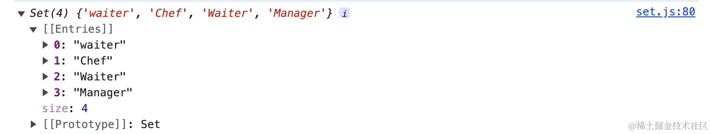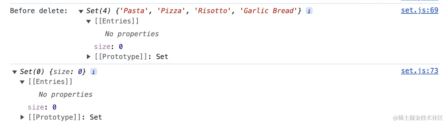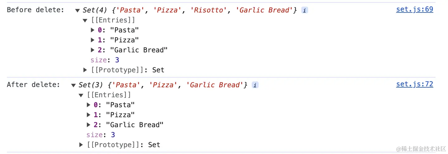 console.log('After delete: ', ordersSet); //注意⚠️:集合是没有索引值的,你无法通过索引像查询数组元素一样查询集合元素