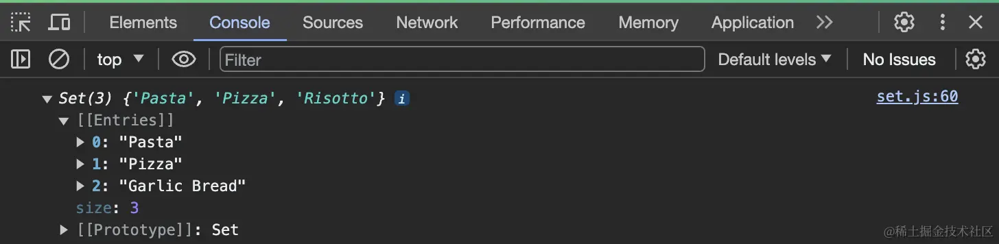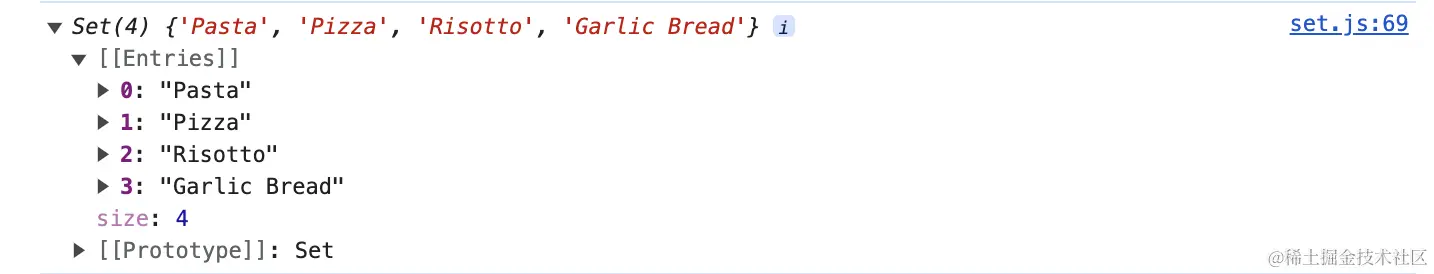同样,在JavaScript中你可以使用集合Set下的has方法来查找集合中对应的元素。例如查找字符串元素'Pasta'``'bread'元素是否在集合中。