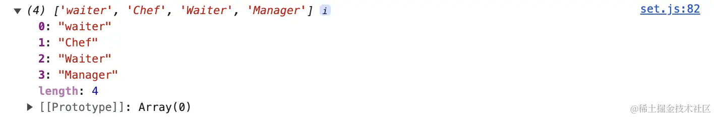 const staff = ['waiter', 'Chef', 'Waiter', 'Manager', 'Chef', 'Waiter'];