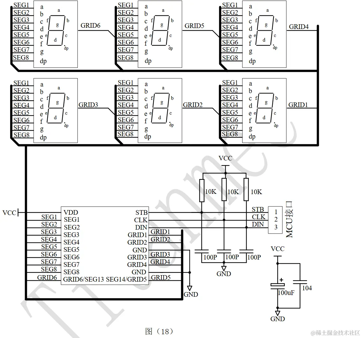 2、连接在DIN、CLK、STB通讯口上下拉三个100pF电容可以降低对通讯口的干扰。