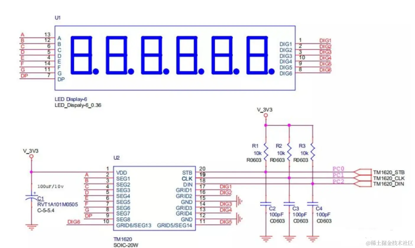 TM1620的STB、CLK、DIN引脚分别连接单片机的PC0、PC1、PC2引脚。