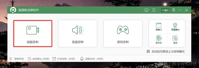 步骤1:在电脑中搜索“数据蛙录屏软件”,找到官网并下载安装该应用程序,打开应用进入到主页面,在这里选择需要的录制模式。