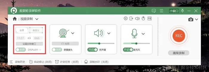 步骤2:进入到视频录制页面中,选择您想要录制的区域:自定义区域或全屏区域,然后点击 “录制” 按钮开始屏幕活动。