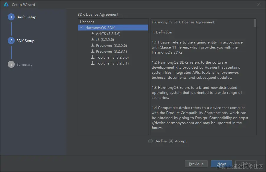 在SDK Setup界面,单击按钮,设置HarmonyOS SDK存储路径,单击Next进入下一步。