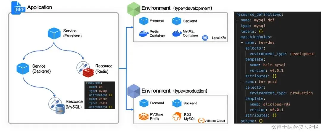 在 Walrus 平台上,运维团队可以通过 ResourceDefinition 声明提供的 Resource(资源)类型以及实际部署资源的底层模板,不同的资源部署模板可以通过自定义规则应用到不同类型的环境、项目等。