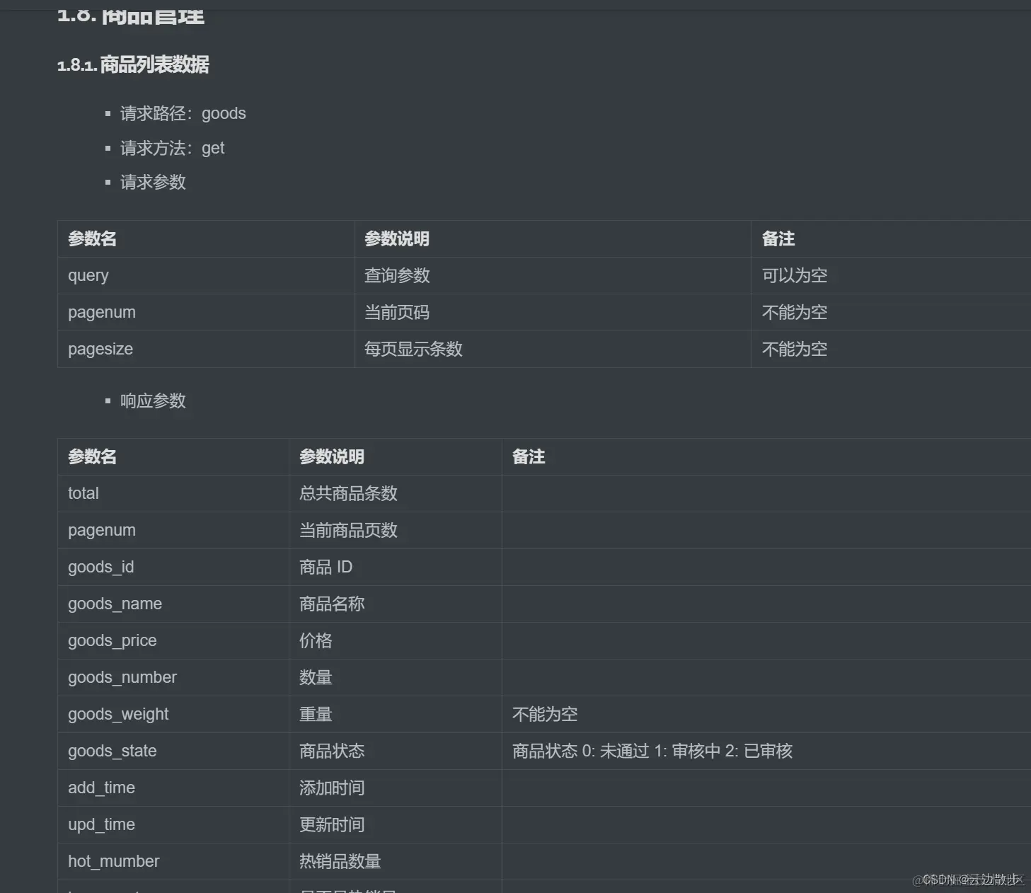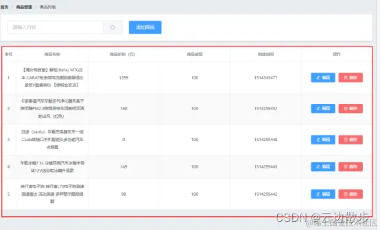 前提:导入了element ui,本文章没有体现到编辑商品和添加商品,你需要有自己的后端接口文档你可以拿我的作为一个参考