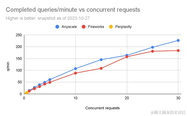 我们可以看到,Fireworks和Anyscale都可以扩展到每分钟完成数百个查询。Anyscale的扩展能力略高一些(最高达到每分钟227个查询,Fireworks最高为每分钟184个查询)。