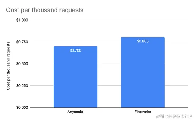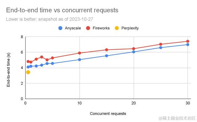 Perplexity目前处于公开测试阶段,因此没有价格可供比较。对于Fireworks,我们使用了其网站上列出的价格,即每百万输入词元收费0.7美元,每百万输出词元收费2.80美元。对于Anyscale Endpoints,根据其定价页所示,无论是输入还是输出,都是每百万个词元1美元。