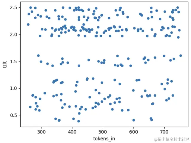 可以看到,在250个词元输入和800个词元输入之间,输入词元与TTFT之间似乎并不存在明显的关系,且因其他原因导致的TTFT的随机噪声“掩盖(swamped)”了这一关系。