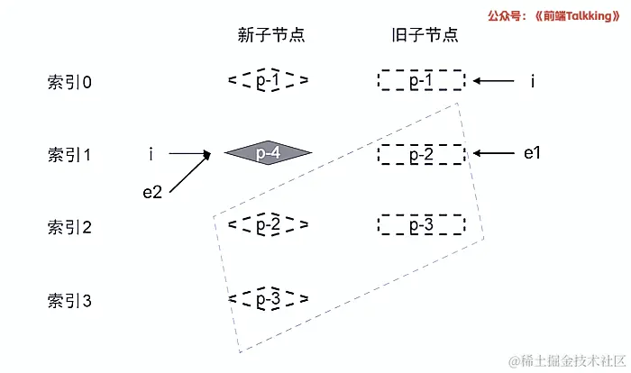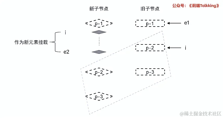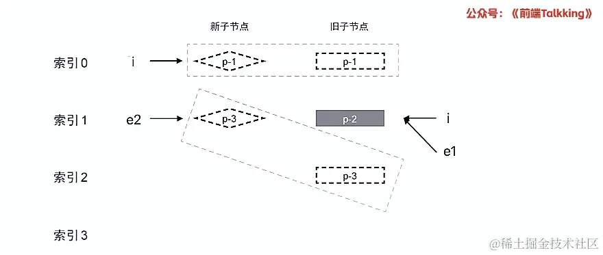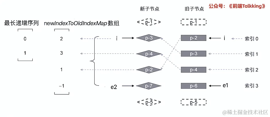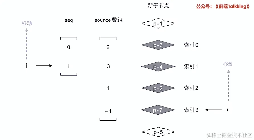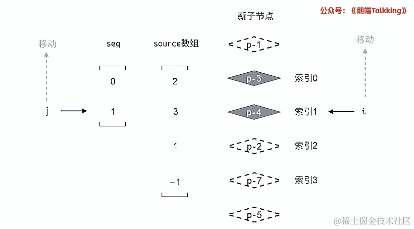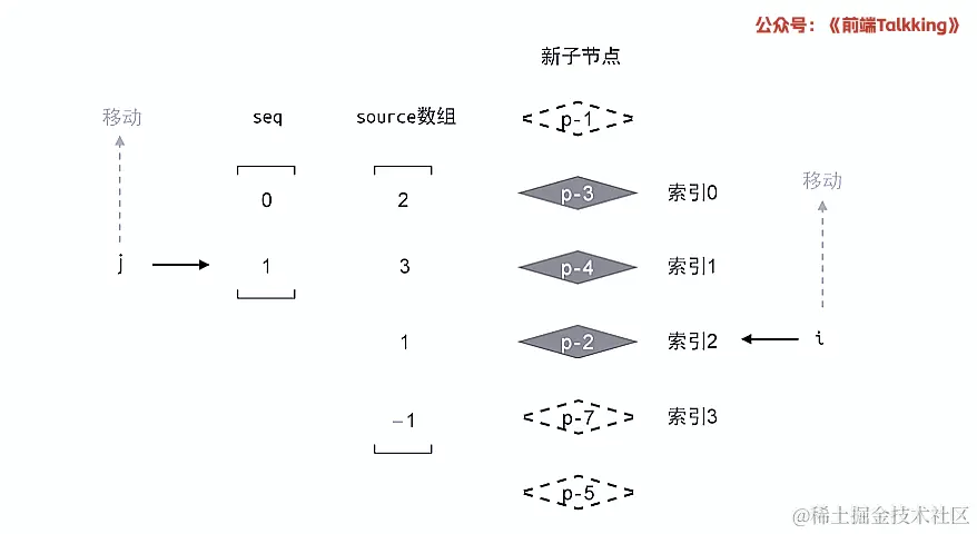 如上图所示,此时索引 i 的值为 2 ,索引 j 的值为 1 ,因此 2 !== seq[1] 成立,因此,节点 p-2 对应的真实节点需要移动。