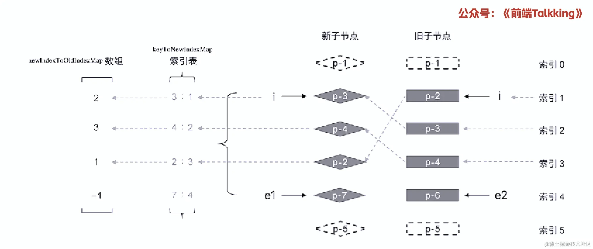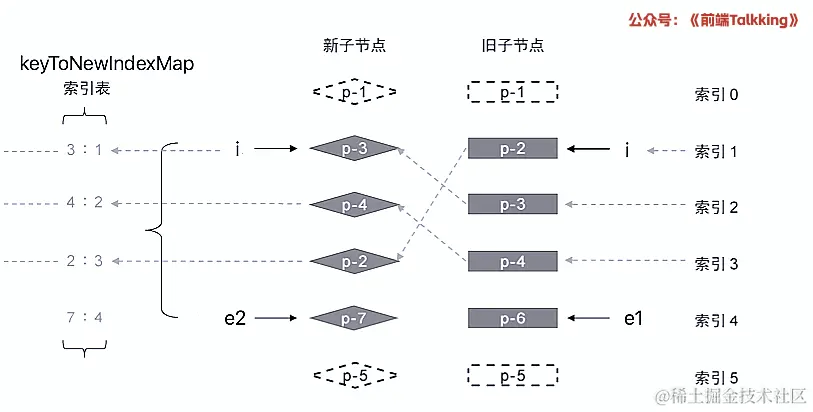 - 拿旧节点的key值去索引表keyToNewIndexMap去查找该节点在新节点中的位置newIndex;
