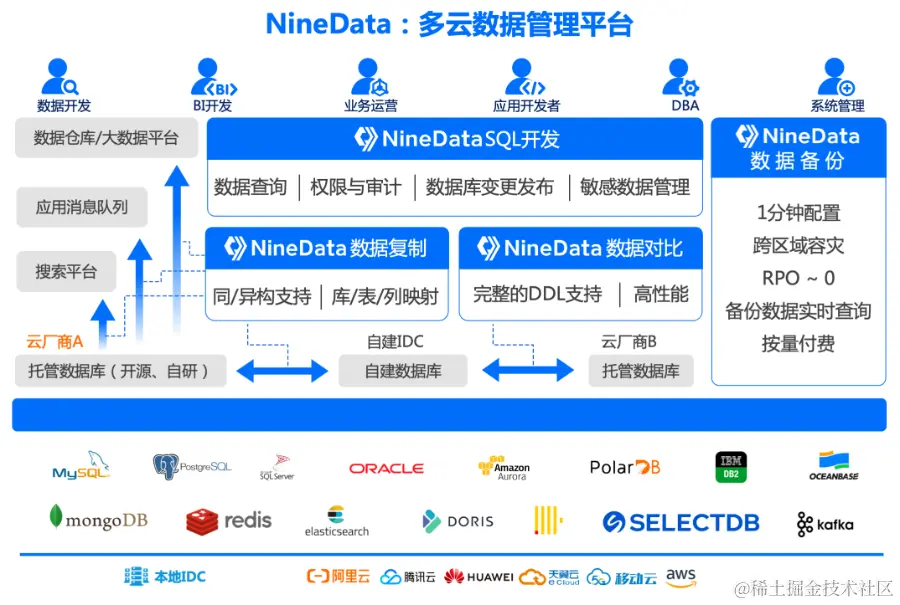 通过NineData平台,企业可以轻松完成日常数据库开发、数据安全访问、数据库权限管理、生产数据库变更与发布、数据库备份恢复、数据库上云迁移、数据库国产化升级迁移、数据库多活容灾、数据仓库及数据湖构建、在线数据库到数据仓库复制(ETL)等。