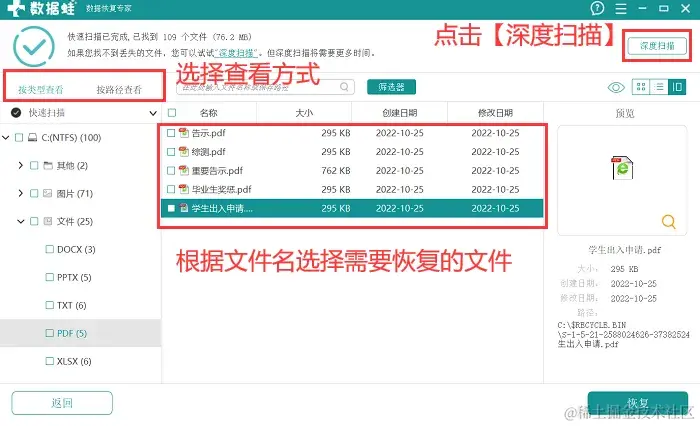 第3步:等待快速扫描完成,对结果进行查看,可以点击【按类型查看】 后直接根据文件名进行选择,若软件没有扫描到相应的数据,单击【深度扫描】获取更深度的数据;