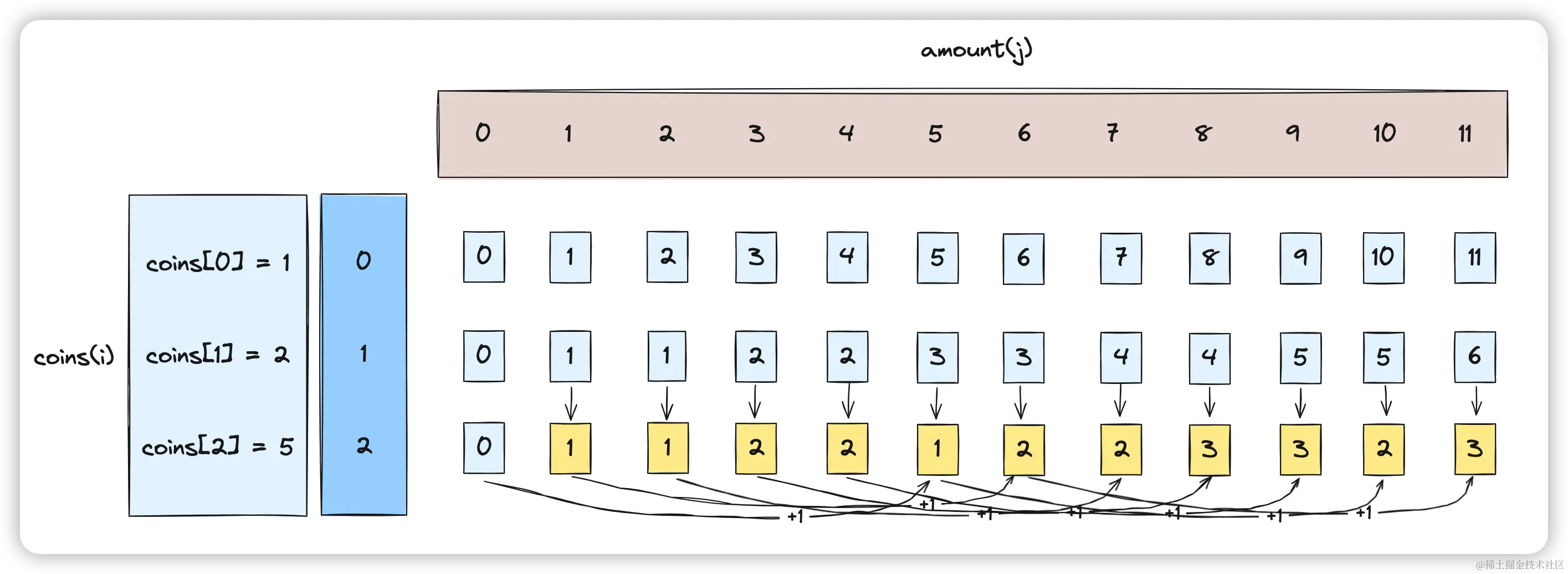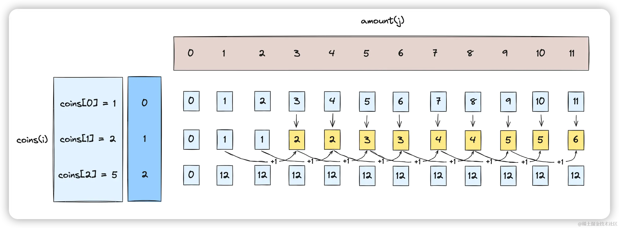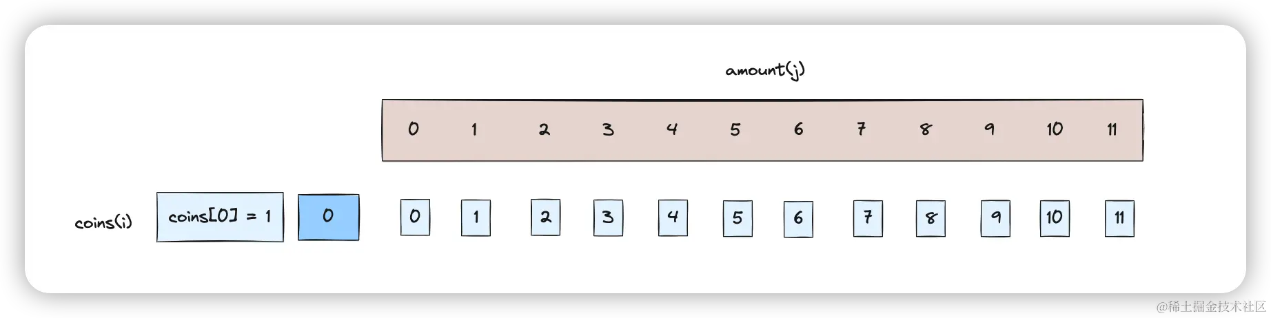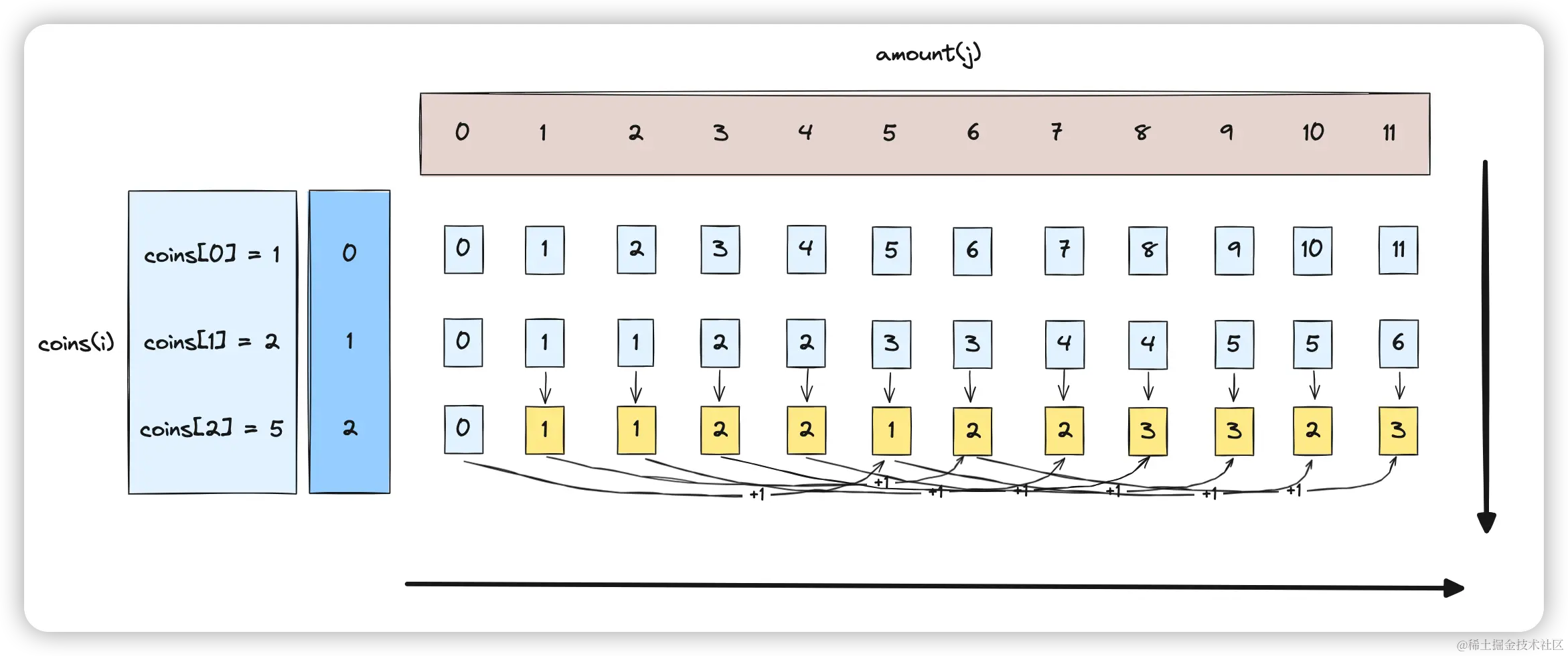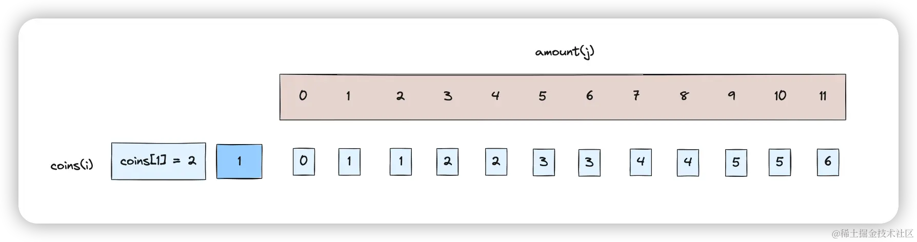 并且总值的增长正好与序号的增长一致,因此我们可以使用一位数组的序号作为总值,一个一个硬币来进行最少硬笔数的计算,不断更新一维数组值,将二维数组压缩成一维数组。此时每个值(dp[j])代表在数组coins的[0,i]范围内取硬币(每个硬币不限数量)总值为j 时的最少硬币数。