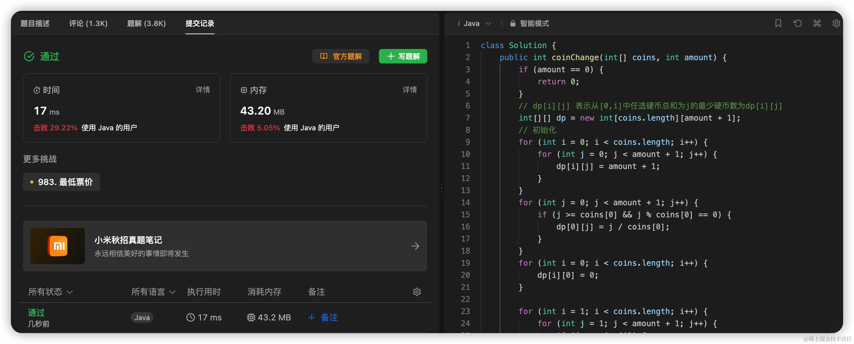 - 时间复杂度:O(n*amount),其中 amount是总金额,n 是数组 coins 的长度