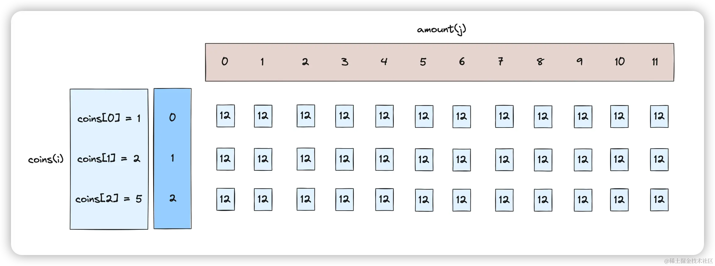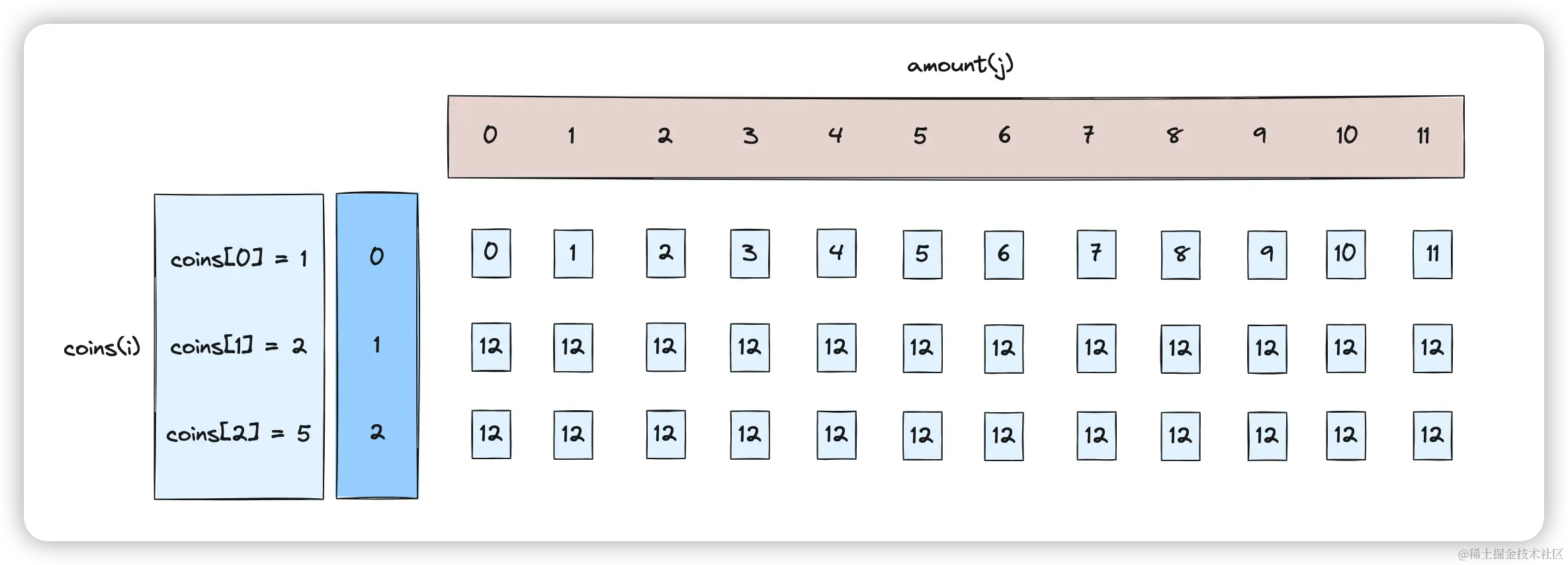 由于题目中求得是最小值,所以需要把数组初始化为最大值,但是因为题目的实际含义,我们可以省点儿事儿,就初始化为amount+1即12,如下图