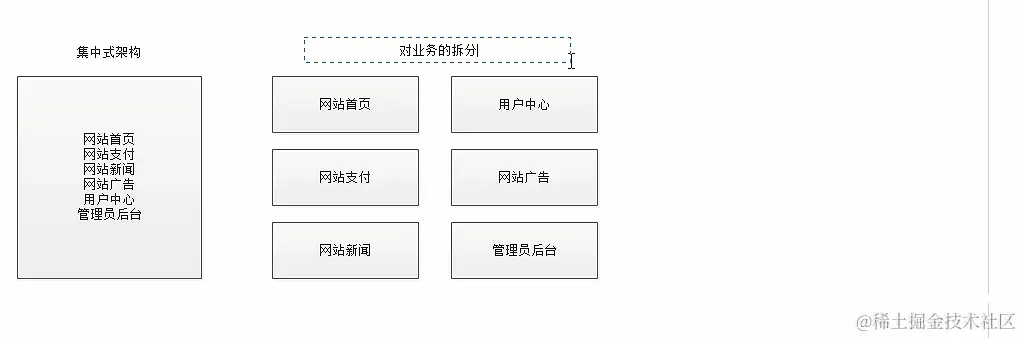 分布式的概念:业务拆分,相关的业务拆分成独立的一个项目