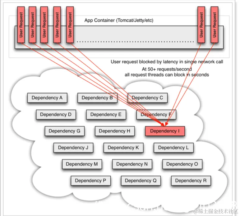 例如微服务I发生异常,请求阻塞,用户不会得到响应,则tomcat的这个线程不会释放,于是越来越多的用户请求到来,越来越多的线程会阻塞: