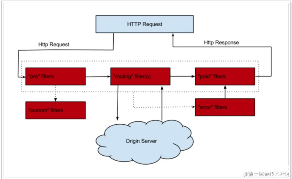 - 请求到达首先会经过pre类型过滤器,而后到达route类型,进行路由,请求就到达真正的服务提供者,执行请求,返回结果后,会到达post过滤器。而后返回响应。
