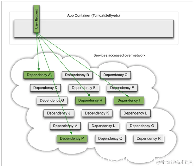 如图,一次业务请求,需要调用A、P、H、I四个服务,这四个服务又可能调用其它服务。