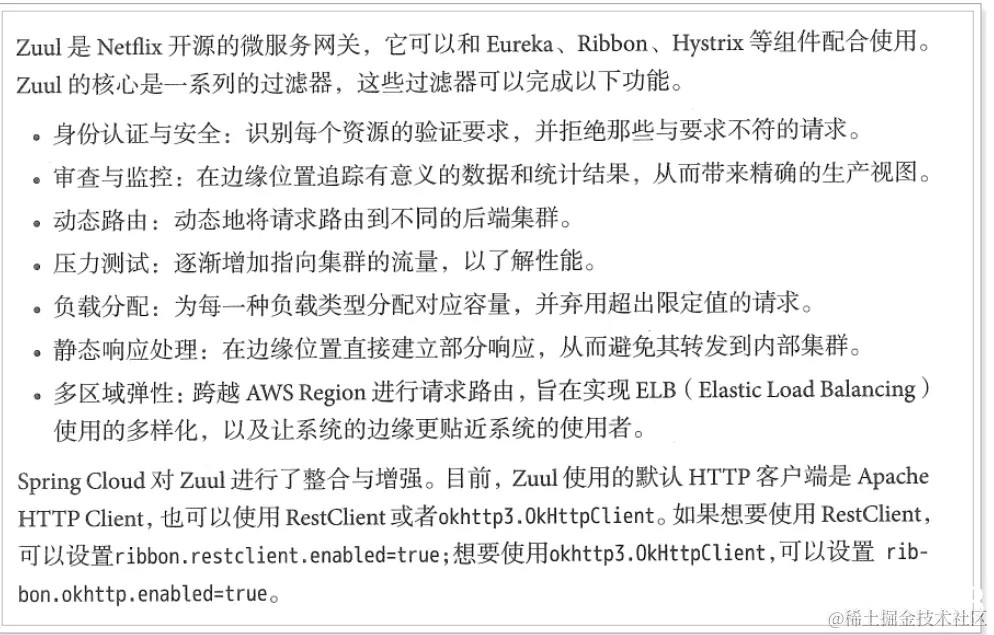 服务网关是微服务架构中一个不可或缺的部分。通过服务网关统一向外系统提供REST API的过程中,除了具备服务路由、均衡负载功能之外,它还具备了权限控制等功能。Spring Cloud Netflix中的Zuul就担任了这样的一个角色,为微服务架构提供了前门保护的作用,同时将权限控制这些较重的非业务逻辑内容迁移到服务路由层面,使得服务集群主体能够具备更高的可复用性和可测试性。