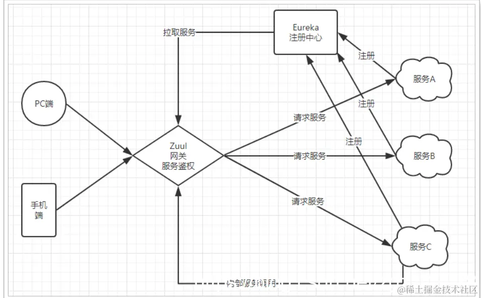 不管是来自于客户端(PC或移动端)的请求,还是服务内部调用。一切对服务的请求都会经过Zuul这个网关,然后再由网关来实现 鉴权、动态路由等等操作。Zuul就是我们服务的统一入口。