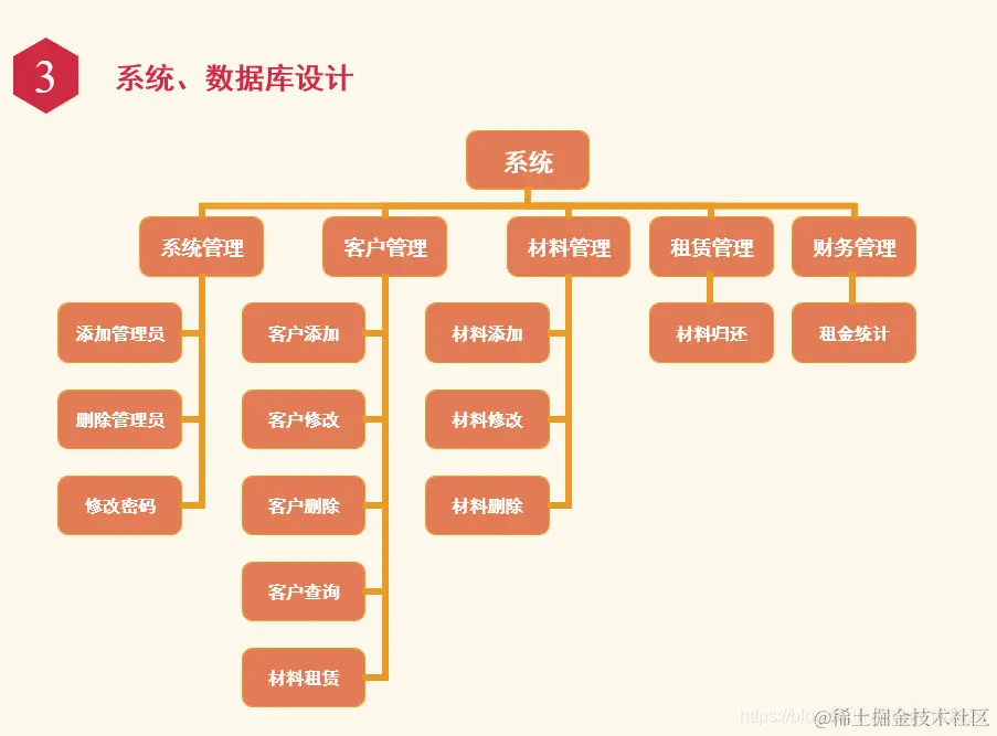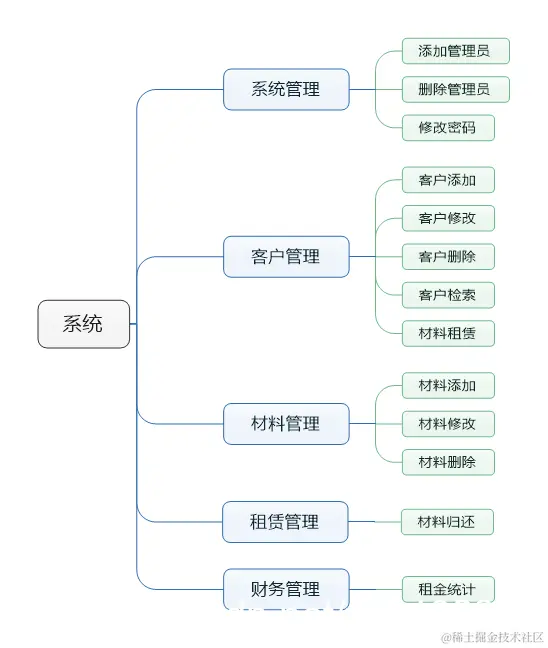 材料租赁管理:包括订单出租查询、器材回收管理、日租金管理、仓库库存管理等。