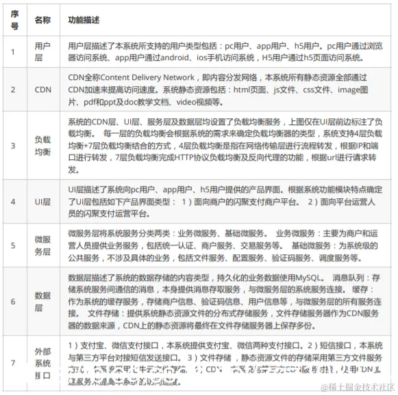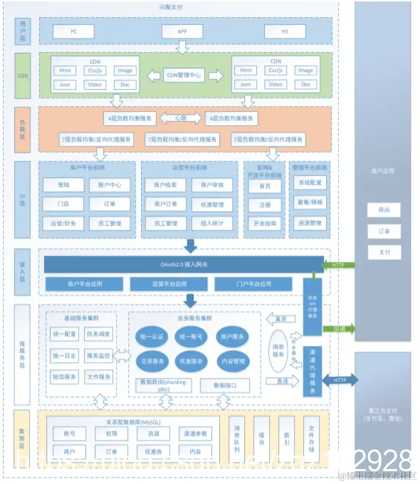 业务流程举例: 1、用户可以通过PC、手机等客户端访问闪聚支付。 2、 系统应用CDN技术,对一些图片、CSS、视频等资源从CDN调度访问。 3、所有的请求全部经过负载均衡器。 4、首先请求UI层,渲染用户界面。 5、商户通过平台进行注册和企业认证,UI层通过网关请求服务层,服务层完成业务处理后将数据持久化到数据 层。