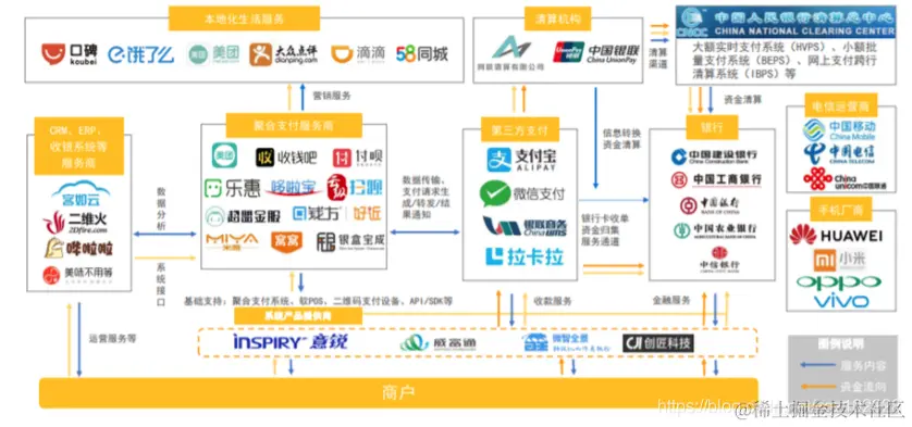 1.1 项目背景 随着移动支付的盛行,商业银行、第三方支付公司、其它清算机构、消费金融公司等众多类型的机构,都在为商户 提供网络(移动)支付解决方案。另一方面,用户的支付需求繁多,支付渠道已呈“碎片化”状态,并且“碎片化”程 度将逐渐加深。聚合支付顾名思义就是将目前主流的支付进行整合,形成第三方支付的聚合通道,也被称为“第四 方支付”。 下图是聚合支付的产业结构: