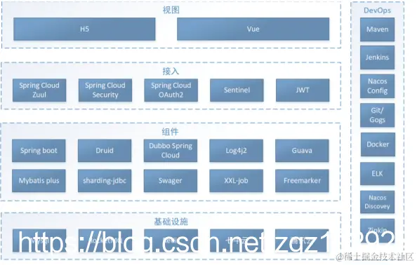 重点了解微服务技术栈: 闪聚支付服务端基于Spring Boot构建,采用Spring Cloud Alibaba微服务架构。 1)基础设施 业务数据持久化采用MySQL,数据缓存采用Redis,采用RocketMQ的事务消息机制完成部分场景下的分布式事务 控制,采用第三方云平台完成文件上传与分布式存储。 2)组件 系统微服务基于SpringBoot开发,数据库连接池采用Druid,POJO构建采用Lombok,日志系统采用Log4j2, Guava工具类库,Mybatis Plus持久层接口实现,Sharding-jdbc分库分表组件,Swagger接口规范组件,XXL-job 分布式任务调度组件,Sentinel限流组件等。 3)接入 Zuul网关完成客户端认证、路由转发等功能,Dubbo RPC完成微服务远程调用,JWT提供前后端令牌管理方案。 4)视图 平台支持H5、PC等各种前端。