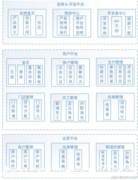 1.3 功能模块 平台主要包括三个模块:官网&开放平台、商户平台、运营平台,详细功能如下