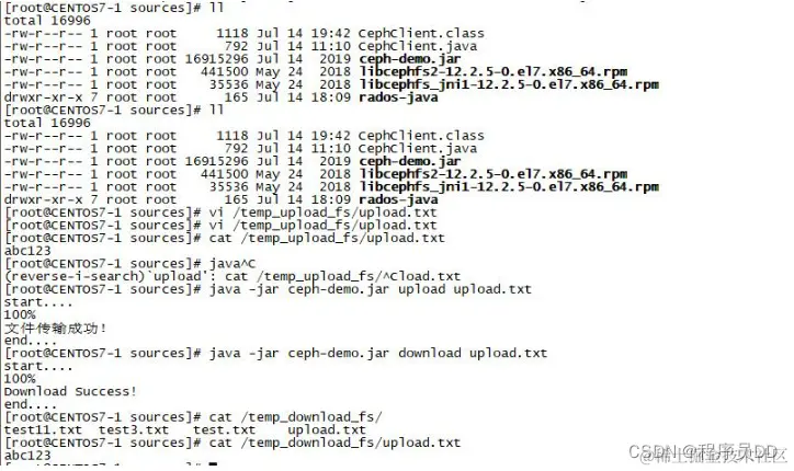 [root@CENTOS7-1 sources]# java -jar ceph-demo.jar download upload.txtstart....100%Download Success!end.... -