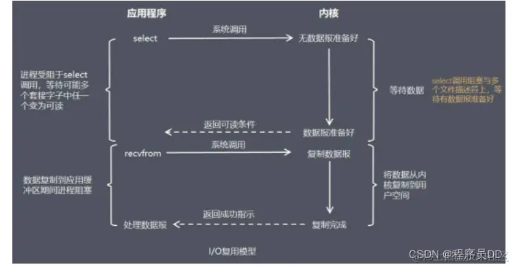 在 I/O 复用模型中,会用到 Select,这个函数也会使进程阻塞,但是和阻塞 I/O 所不同的是这两个函数可以同时对多个 I/O 操作。而且可以同时对多个读操作,多个写操作的 I/O 函数进行检测,直到有数据可读或可写时,才真正调用 I/O 操作函数。