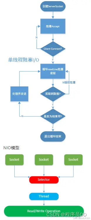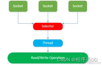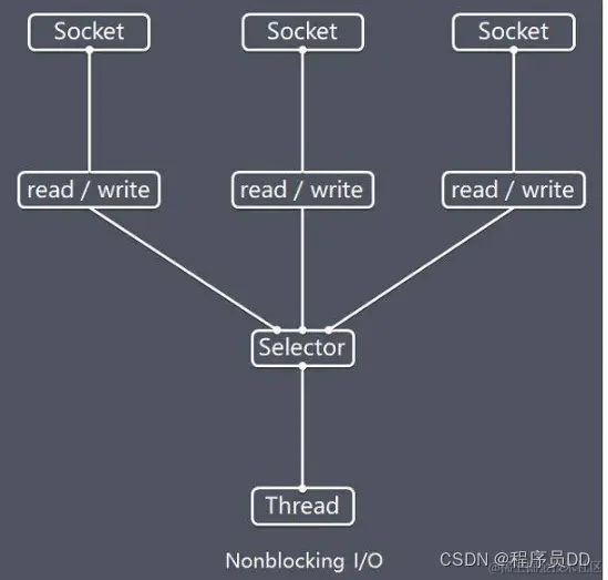 NIO模型中的Selector是Java的非阻塞I/O实现的关键,它使用了事件通知API以确定在一组非阻塞套接字中有哪些已经就绪能够进行I/O相关的操作。因为可以在任何的时间检查任意的读操作或者写操作的完成状态,一个单一的线程便可以处理多个并发的连接。