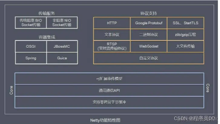 - Core 核心, 可扩展事件模型、通用通信 API、支持零拷贝的 ByteBuf 缓冲对象。