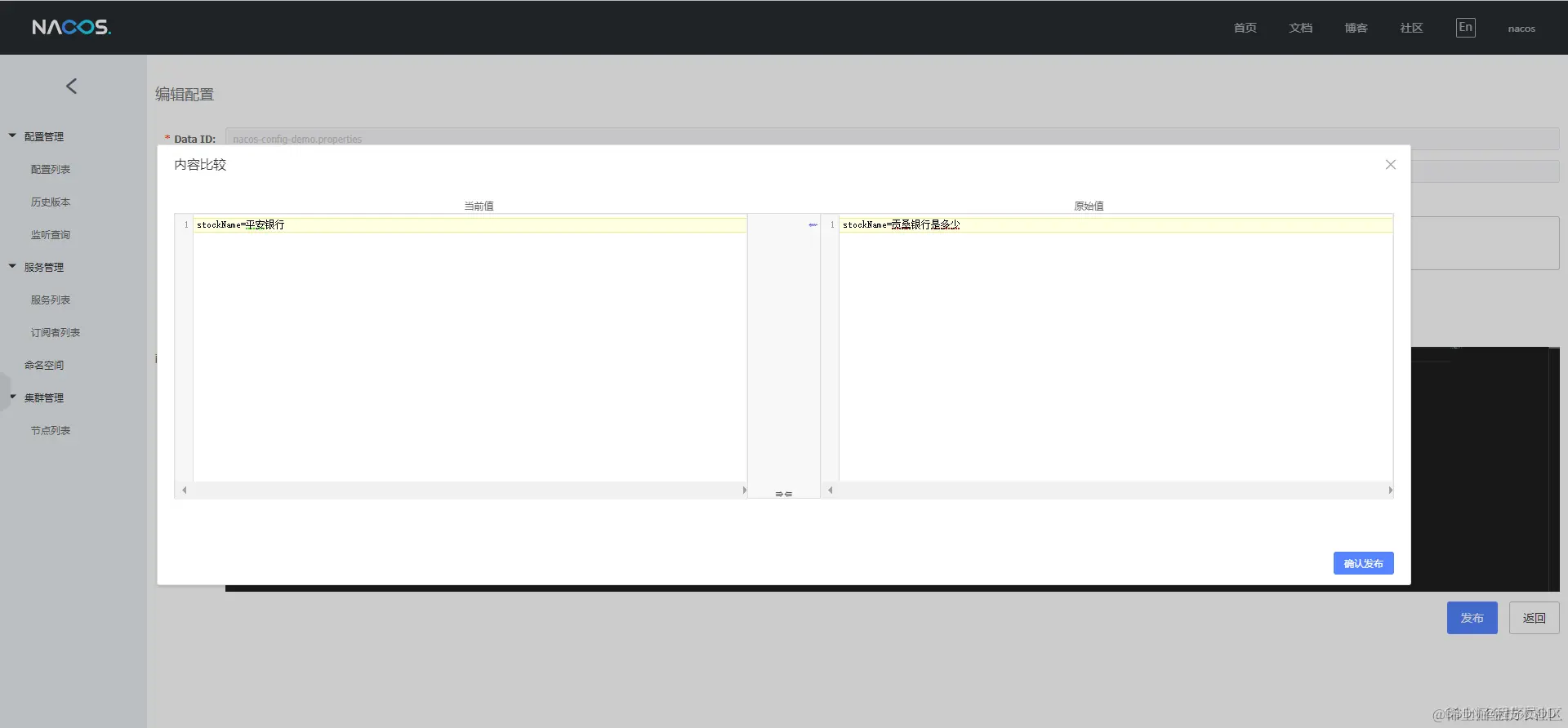 server.port=8080 spring.application.name=nacos_config_demo spring.cloud.nacos.config.server-addr=127.0.0.1:8848 spring.cloud.nacos.discovery.server-addr=127.0.0.1:8848 # 指向配置中心的文件ID spring.cloud.nacos.config.shared-data-ids=nacos_config_demo.properties # 指定需要刷新的配置中心文件ID spring.cloud.nacos.config.refreshable-dataids=nacos_config_demo.properties要指定Nacos配置的data id, 注意需加上完整的扩展名, 动态配置生效, 需要加上refreshable-dataids,支持多个配置文件, 以逗号","分隔。