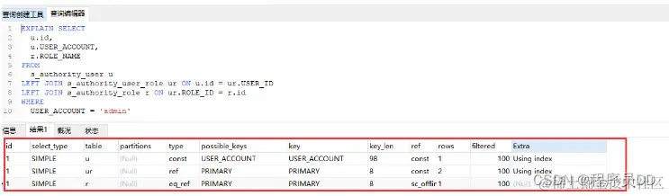 EXPLAIN SELECTu.id,u.USER_ACCOUNT,r.ROLE_NAMEFROMs_authority_user uLEFT JOIN s_authority_user_role ur ON u.id = ur.USER_IDLEFT JOIN s_authority_role r ON ur.role_id = r.idWHEREu.USER_ACCOUNT = 'admin'第二条语句是一个多SQL查询: