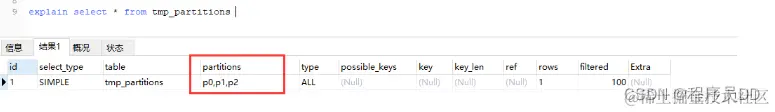 drop table if exists tmp_partitions;create table tmp_partitions (id int unsigned not null AUTO_INCREMENT,name varchar(255),PRIMARY KEY (id)) engine = innodbpartition by key (id) partitions 3;查看其执行计划: