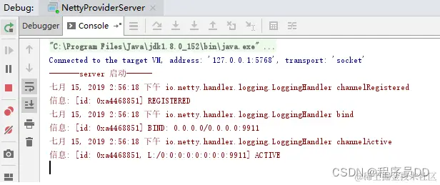 public class NettyProviderServer { private int port; public NettyProviderServer (int port){ this.port = port; } // netty 服务端启动 public void runServer() throws Exception{ // 用来接收进来的连接 EventLoopGroup bossGroup = new NioEventLoopGroup(); // 用来处理已经被接收的连接,一旦bossGroup接收到连接,就会把连接信息注册到workerGroup上 EventLoopGroup workerGroup = new NioEventLoopGroup(); try { // nio服务的启动类 ServerBootstrap sbs = new ServerBootstrap(); // 配置nio服务参数 sbs.group(bossGroup, workerGroup) .channel(NioServerSocketChannel.class) // 说明一个新的Channel如何接收进来的连接 .option(ChannelOption.SO_BACKLOG, 128) // tcp最大缓存链接个数,它是tcp的参数, tcp_max_syn_backlog(半连接上限数量, CENTOS6.5默认是128) .childOption(ChannelOption.SO_KEEPALIVE, true) //保持连接 .handler(new LoggingHandler(LogLevel.INFO)) // 打印日志级别 .childHandler(new ChannelInitializer<SocketChannel>() { @Override protected void initChannel(SocketChannel socketChannel) throws Exception { //管道注册handler ChannelPipeline pipeline = socketChannel.pipeline(); //编码通道处理 pipeline.addLast("decode", new StringDecoder()); //转码通道处理 pipeline.addLast("encode", new StringEncoder()); // 处理接收到的请求 pipeline.addLast(new NettyServerHandler()); // 这里相当于过滤器,可以配置多个 } }); System.err.println("-------server 启动------"); // 监听输入端消息并发送给所有客户端 new Thread(new Runnable() { @Override public void run() { try { while (true) { BufferedReader in = new BufferedReader(new InputStreamReader(System.in)); String str = in.readLine(); if (NettyServerHandler.channelList.size() > 0) { for (Channel channel : NettyServerHandler.channelList) { channel.writeAndFlush(str); } } } }catch(Exception e) { e.printStackTrace(); } } }).start(); // 绑定端口,开始接受链接 ChannelFuture cf = sbs.bind(port).sync(); cf.channel().closeFuture().sync(); } finally{ bossGroup.shutdownGracefully(); workerGroup.shutdownGracefully(); } } // 开启netty服务线程 public static void main(String[] args) throws Exception { new NettyProviderServer(9911).runServer(); } }服务端监听9911端口, 客户端连接时需指定此端口。
