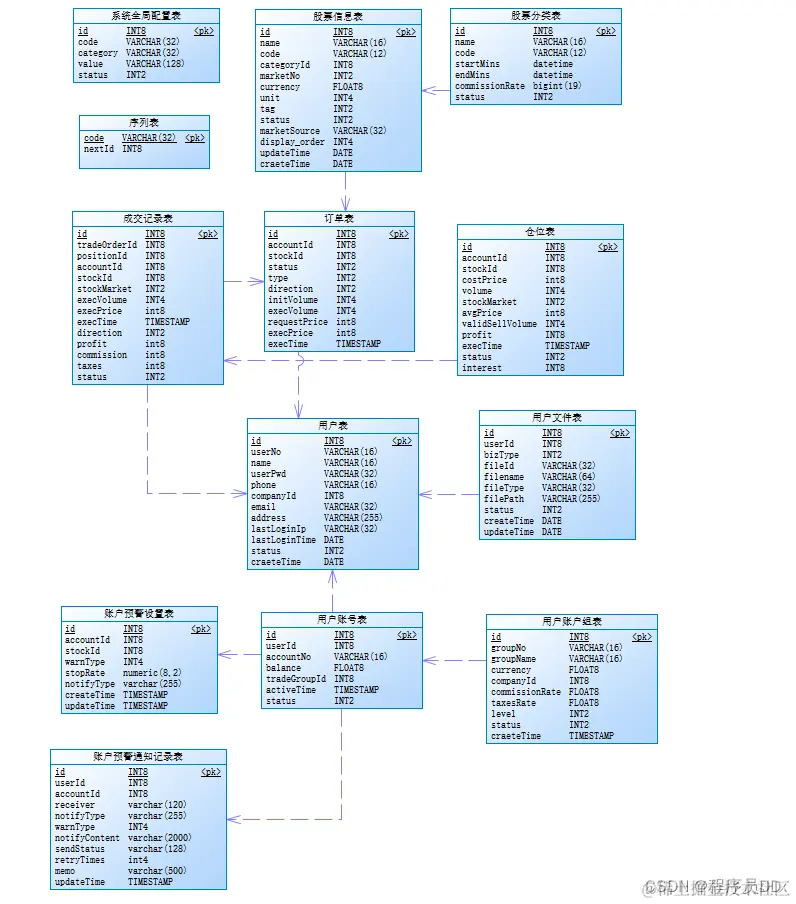 - 交易系统的设计是整个设计的核心部分, 如何拆分, 建立表关联, 既不能太复杂, 也不能过于简单, 可以参考行业的规范, 这是经过多年的累积, 且经历过长期的验证, 能够满足业务功能要求, 同时又具备较强的扩展性, 不仅适用于股票, 还可适用于外汇, 贵金属, 期货等产品, 在报表加工统计方面, 结构层次清晰, 利于呈现。