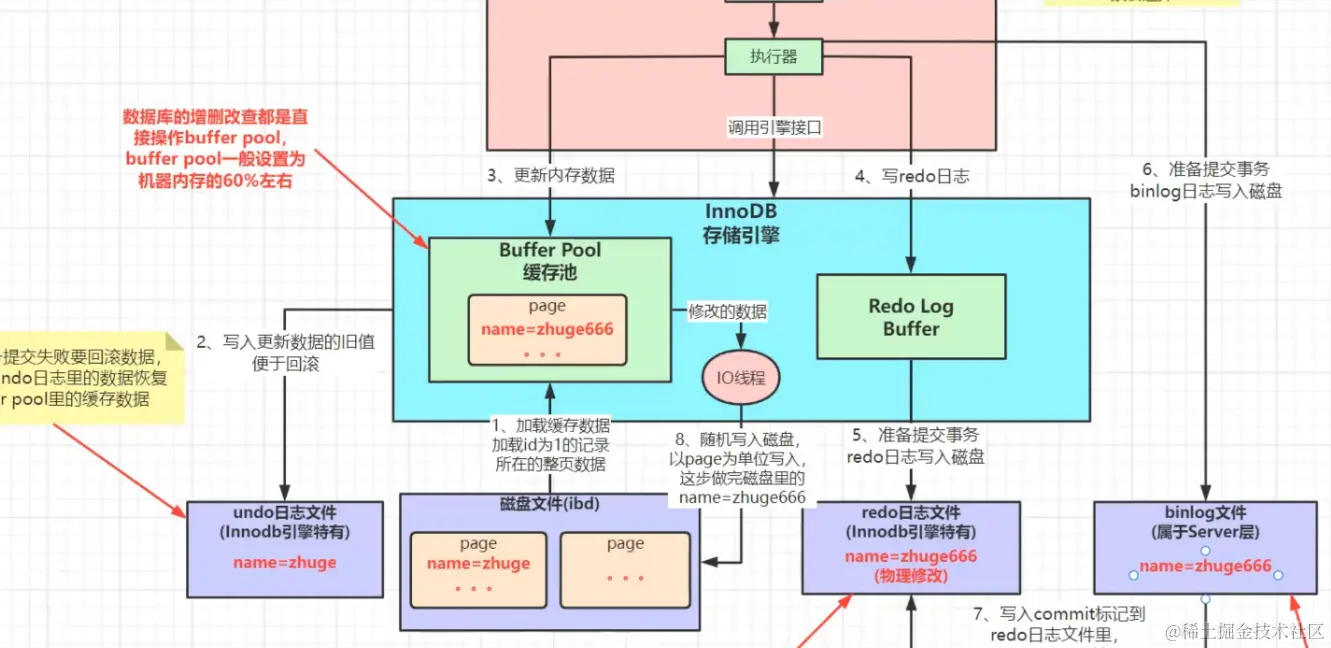 6.buff pool里面会有一个缓存池有一个异步线程会用随机写的方式持久化到磁盘上面去。