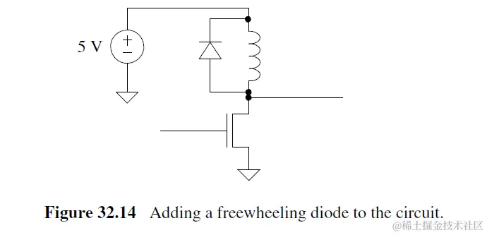 对于电感接一个switch, 当switch关闭时电感电流会导致Vds变得很大, destroy管子, 因此可以加diode, 也称为commutating, snubber, suppressor, catch, or freewheeling diode. 确保Vds被钳位在5.6V