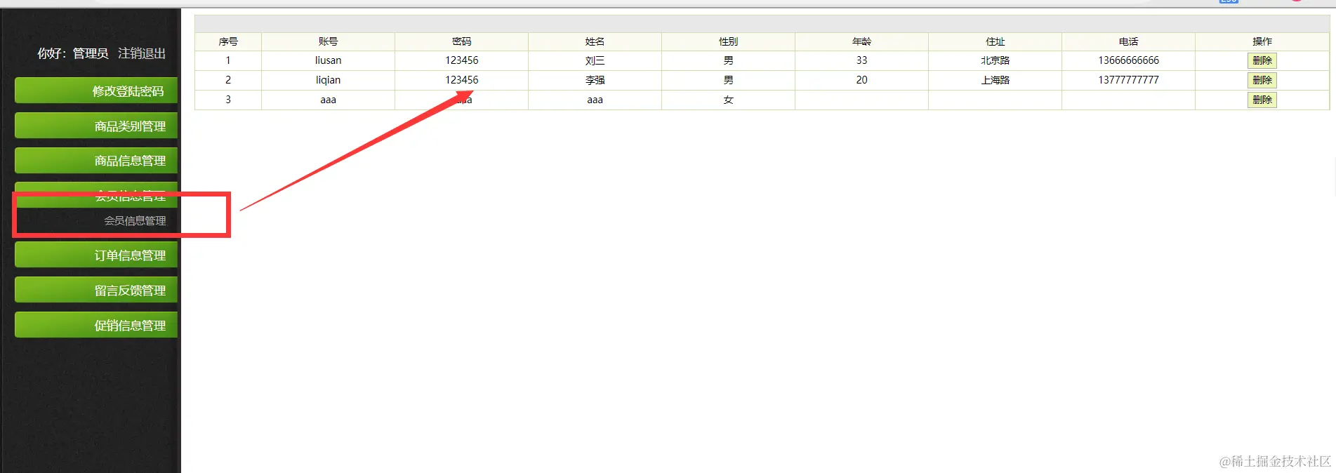 |--会员信息管理 主要实现会员信息的查询,删除功能