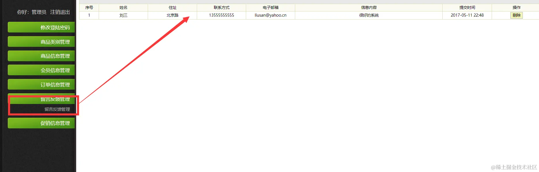 |--留言反馈管理 主要实现会员留言的查询和删除功能