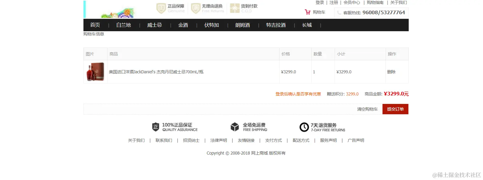 商品加入购物车后可以提交订单,也可以查看自己的所有订单