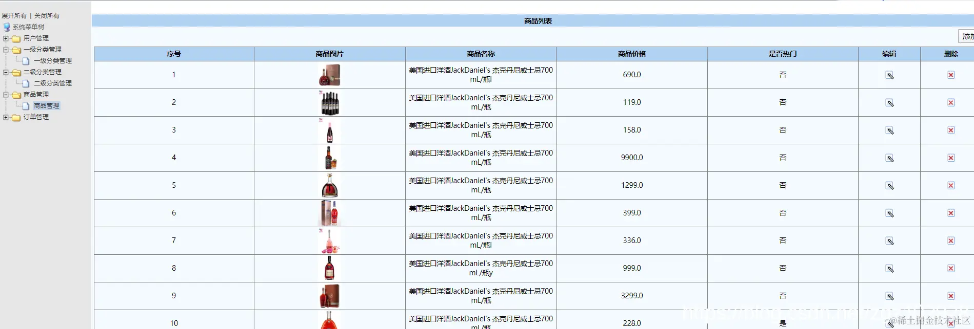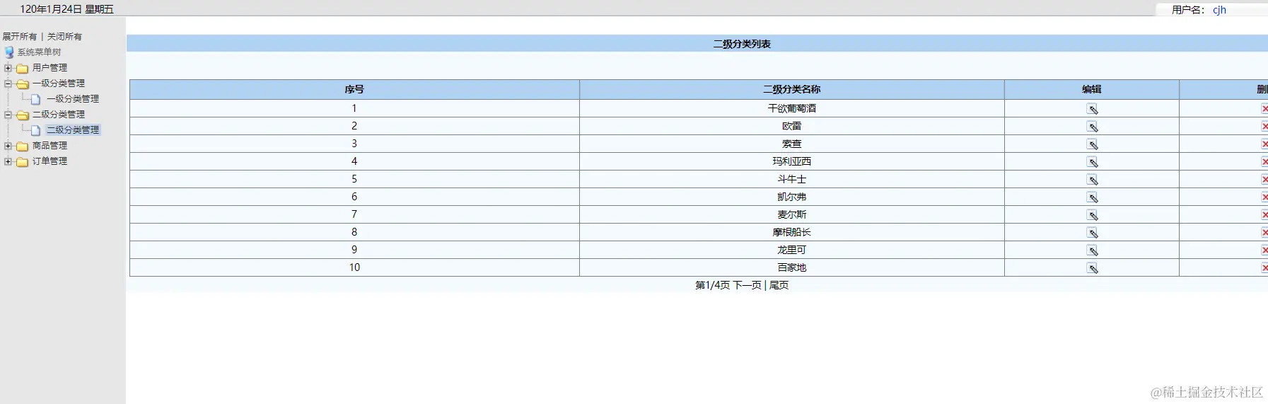 二级分类管理功能:可以查询所有二级分类,添加新的二级分类,删除已有的分类