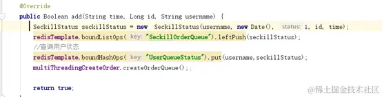 如图在添加订单的时候,同时添加一个状态信息进去,这样读取的时候就可以读取到抢单成功的状态信息:最后在支付的成功的时候更新对应的Redis中的值的信息