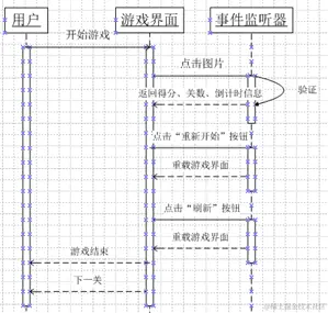 一次游戏活动的顺序图如图5~~-~~*-*10所示,一次游戏过程中,“点击图片”、“点击‘重新开始’按钮”、“点击‘刷新’按钮”操作上可不分时间先后顺序。每一次游戏结束后可以开始新一局游戏直至用户退出游戏。