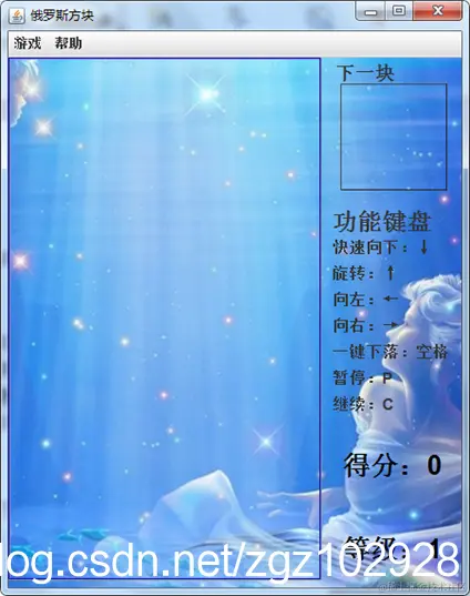 俄罗斯方块项目,基本功能包括:游戏主界面显示模块、方块及数据显示模块、方块移动控制模块、游戏界面颜色控制模块、游戏进度、等级控制模块等。本项目结构如下: (1)游戏主界面显示模块: 显示游戏和帮助两个菜单; 游戏使用功能键盘,得分 等级;