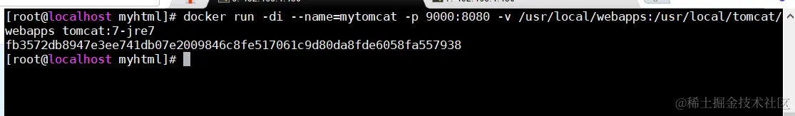 docker run -di --name=mytomcat -p 9000:8080 -v /usr/local/webapps:/usr/local/tomcat/webapps tomcat:7-jre7